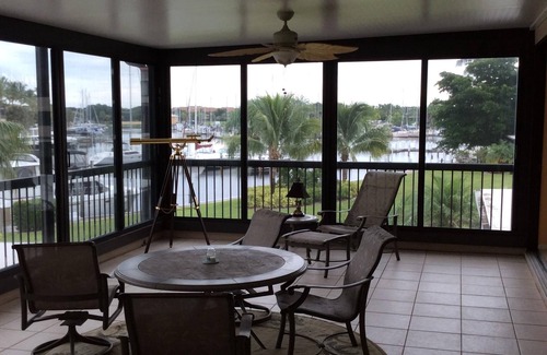 This condo is located in the upscale south shore area of burnt store marina. From the fully furnished and enclosed lanai you have amazing views of the marina and harbor. The kitchen hosts granite counter tops and is fully stocked with dishes, microwave, stove, and refrigerator. The master bedroom has a king size bed, view to the marina, and a huge flat screen TV. The master bathroom has tub/shower combo, his/hers sinks, private toilet room, and lots of closet space. Guest bedroom #1 has a queen size bed, TV, and lots of closet space. Guest bedroom #2 has two twin beds, flat screen TV, and lots of closet space. The living room has huge couch with reclining sections, a huge flat screen TV, DVD player, movie collection, blue tooth sound system, and stereo. The dinning area has a formal dinning table and breakfast bar off of the kitchen. This unit is steps away from the pool, restaurant, ship store, and docks.