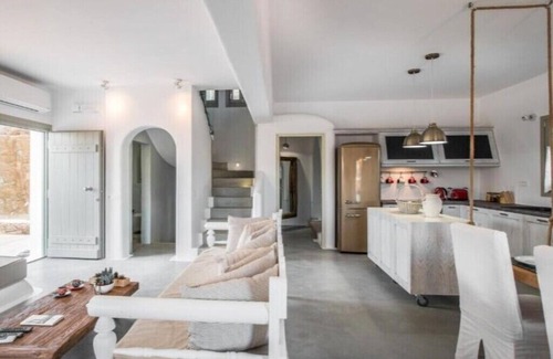 This 3-bedroom villa is decorated in a Cycladic style and offers a private hydrotherapy spa, as well as special horizontal hydromassage facilities. It includes a fully equipped kitchen with a dining area and a living room with a flat-screen TV and a fireplace.