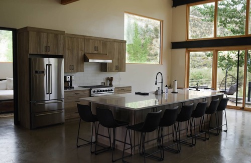 The Birch Creek House is a 1900sqft, 3 bed, 3.5 bath house on 160 private acres 5 miles outside of the City of Escalante. The house is steps away from its name sake, the Birch Creek, which cascades down 2 waterfalls before joining with North Creek to form the Escalante River. The land borders Grand Staircase Escalante National Monument. In addition to the double waterfall mentioned above, the property also features several pictographs, petroglyphs, cliff dwellings of past inhabitants.