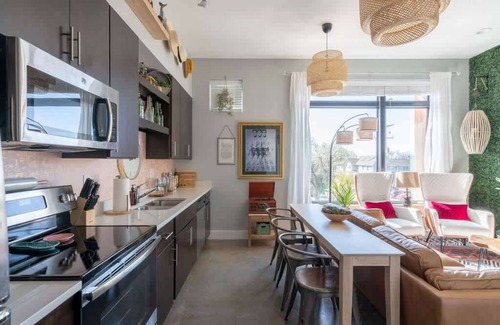 Discover a beautiful bohemian one-bedroom apartment nestled in the super trendy Nations neighborhood of Nashville. This luxe apartment is perfect for a romantic getaway, offering a mix of comfort and style just steps away from local hot spots. Enjoy nearby attractions like Bare Bones Butcher, Fat Bottom Brewing, and Pepperfire Hot Chicken. For even more options, take a short 3-minute drive to Sylvan Park, home to the famous Hattie B's. With a 10-17 minute Uber or Lyft ride to downtown costing roughly $10-15 or less, you can easily explore the vibrant city.