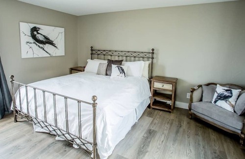 The Raven Suite at Rellik House includes one bedroom with a king-size bed and one bathroom. A queen-size Murphy Bed in the living room can accommodate two additional guests. The kitchenette is outfitted with microwave, refrigerator, coffee maker, and washer and dryer. There is a TV with basic cable. The Raven Suite shares 15-acres with Rellik Winery, Tasting Room, and Vineyard as well as a lovable herd of alpacas and llamas. Enjoy a relaxing getaway in the Southern Oregon wine country! A fire pit with comfortable outdoor seating, and outdoor swimming pool are shared by all guests.