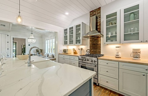 Step into a stylish, open concept living space filled with natural light, neutral tones, and a refined rustic charm. The gourmet kitchen is fully stocked and features a farmhouse sink, quartz countertops, stainless steel appliances, and a breakfast island with barstools. Gather at the dining table beneath a glowing chandelier or enjoy casual meals outdoors. The living area offers plush seating and TV, ideal for relaxing after a day of adventure.