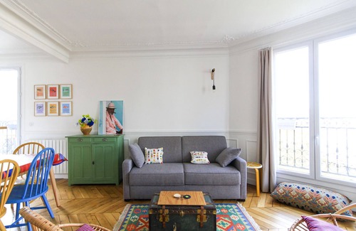 I welcome you in my 59 square meters flat bathed in light, in the heart of Batignolles. On the 5th floor with a splendid view of the roofs of Paris without any opposite, which is very rare!