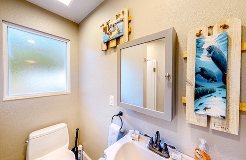 Step inside this retreat and be welcomed by a sun-filled, spacious living area complete with plush seating, a large TV, and artful beach decor. Host a family movie night while streaming your favorite shows or break out the board games at the adjacent dining table. A well-equipped kitchen hosts modern appliances and plenty of storage for creating effortless home-cooked meals. Even better, grill up the catch-of-the-day on the deck and unwind, sharing lots of laughter and sunshine. The bedrooms are inviting with soft, cozy linens, additional TVs, and thoughtful accents ensuring ultimate comfort and relaxation every moment of your stay. Central air conditioning and a private washer/dryer round out this home’s stellar perks.