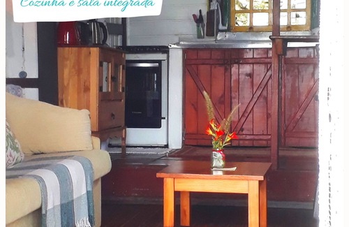 The cabin space consists of a bedroom with double bed, bathroom, kitchen with basic utensils and appliances, combined with the living room, which has 2 sofa beds, a table for using a notebook, and studies. It has a small laundry area with washing machine tank, clothesline. An entrance area with a table, benches and wooden deck, to enjoy the beautiful evenings!
