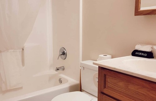 The kitchen is tiled andhas a very workable layout with plenty of cupboard space, equipped with all the essentials. Enjoy views of Muskie Bay from the comfy couch in the living room, furnished with a small dine-in table. The bathroom has a combination shower and tub and nice vanity.