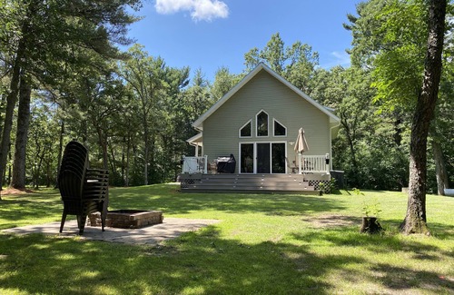 This 1.5 acre pie-shaped lot offers a private escape to the woods, with a short 2 minute walk to the shared pier. Dock your boat during your entire stay on the shared pier and enjoy endless lake activities. Star gaze the vast night skies, roast marshmallows, laugh and tell family tales around the campfire in the evenings, and relax on the deck with rocking chairs.