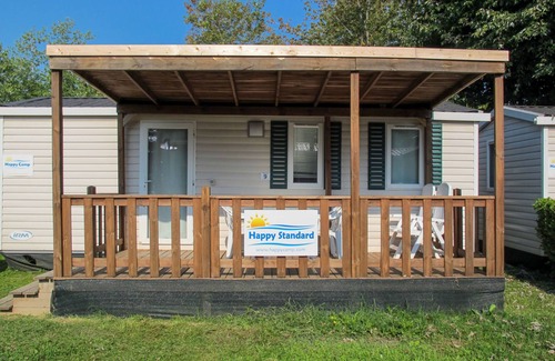 "Happy Easy", 3-room mobile home 25 m2. Object suitable for 4 adults + 1 child. Practical furnishings: living/sleeping room with 1 sleeping facility, dining table, electric heating and air conditioning. 1 room with 1 french bed (140 cm, length 190 cm). 1 room with 2 beds (70 cm, length 190 cm), 1 x 1 bunk beds (65 cm, length 179 cm). Open kitchen (4 hot plates). Shower/WC. Air-conditioning (extra). Terrace roofed. Terrace furniture, electric barbecue (portable), deck chairs (2). Facilities: mosquito net. Parking (1 car). Please note: non-smokers only. Maximum 1 small pet/ dog allowed. IT023059B1D3TAW9IS