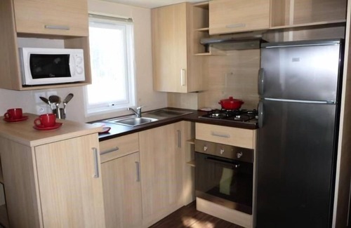 The mobile home is equipped: a 4-burner gas hob, a fridge-freezer, an oven or a dishwasher, a microwave, an extractor hood, an electric coffee maker, a toaster and all kitchen utensils A television is also available in the living room Free Internet connection Blankets and pillows are provided (sheets optional) Air conditioner Terrace with garden furniture