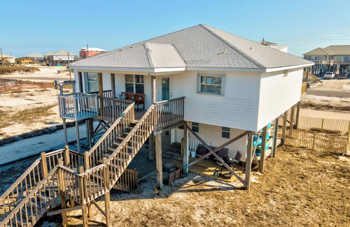 051 Topsail - POOL added March 2024 - Dauphin Island's new sweet spot with above ground pool/deck coming soon!!! Fantastic location on the 2300 block of Bienville's West end, this house puts you canal-front with an ahhmazing gulf view. So many extras, let's jump right in! How about three seating areas on the front porch including a porch bedswing, all in earshot of the crashing waves? Interior decor was inspired to draw feelings of serenity and relaxation as soon as you step foot inside. Master has a King bed, walk-in closet, and tons of bathroom counterspace, behind a custom barn door. 2nd (Queen) and 3rd bedroom (Full + twin/twin bunk) are connected by a full bath with a walk in shower with attached bar including wand. Fully stocked kitchen, 6 top dining table (+4 barstools @breakfast bar), and flat screen tv with satellite are all a part of the light and beachy open common area. Your surprise element provided in the downstairs finished room-a full game room complete with an authentic MZ. PACMAN arcade game, foosball table, flatscreen tv with satellite, full size game table/ games and twin size bed! House also comes with fishing rods, kayaks, SUP, and floating mat!