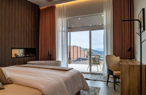 One of the suites on the premises, unique luxury accommodations near Yosemite National Park. Brand new, high end construction on 60 acres with spectacular views. Each bedroom is a private suite, with ensuite bath, soaking tub and private patio with unobstructed views. Beautiful living & dining area with open kitchen. Expansive patio area for outdoor dining and socializing. Relax and enjoy the view from the swim spa and hot tub. Make your forever memories at Horizon by Yosemite!