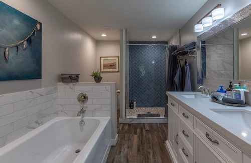 Each of the bedrooms has comfortable beds. A portable crib is also available for your little one. Full bathrooms have a tub/shower combo and the private master suite features a soaking tub and tiled shower. The full kitchen allows you to cook your best home dishes. There is plenty of room to dine and entertain. The large table seats 10 and the island has 6 bar stools for additional seating, and a highchair is available if needed.
