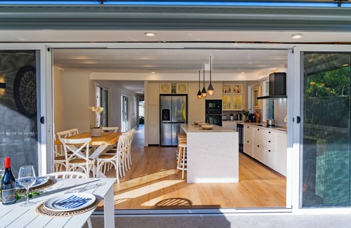 bedrooms plus in the lounge and kitchen, new furniture, three modern bathrooms, and a well-equipped kitchen with Smeg, Miele, and Ariston appliances. Indoor dining opens to an outdoor deck with seating for 12, a bar fridge, gas BBQ, and fire pit—all overlooking a lush palm garden. The recreational living space includes a 75-inch TV and Netflix. Bedrooms, in calming coastal tones, offer comfort and storage. Modern bathrooms with natural light, large basins, and showers enhance the experience. An Electrolux washer and dryer are available for convenience.