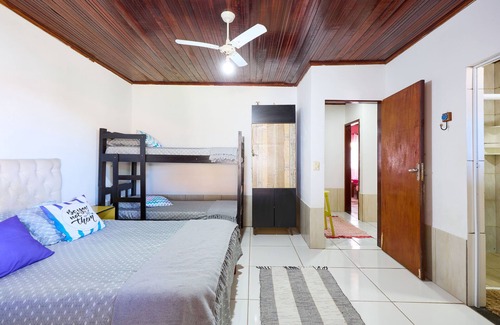 House with 3 bedrooms and one suite with double bed and bunk bed, one with double bed and 2 bunk beds and the third with double bed and two single beds plus an auxiliary bed, all with ceiling fan plus two bathrooms , large living room with LCD TV with Sky, wifi, full kitchen with coffee maker, dishes and utensils, microwave, large outdoor leisure area with table with chairs, swimming pool, large outdoor leisure area with table with chairs, pool, gourmet area with barbecue, refrigerator and stove, all lawn land. Garage for up to 5 cars. We accept small animals. We deliver pillow-lined beds with pillowcase and sheet (Basic bedding), the day before check in the house goes through a cleaning leaving everything very clean and prepared to wait for your group. Rental includes basic bedding.