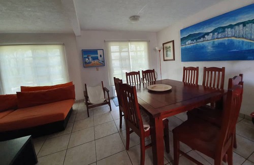 Casa a 5 minutos de la playa caminando, con 3 recamaras con baño, aire acondicionado y ventilador, sala, comedor, cocina con utensilios, horno de microondas y cafetera, servicio de toallas. Áreas comunes como alberca, ciclopista, lago artificial, cancha de tenis, estacionamiento, vigilancia las 24 hrs.