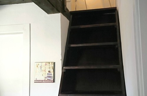 Opposite the kitchen is the bathroom with shower and toilet and next to a wooden staircase to a gallery with double bed.