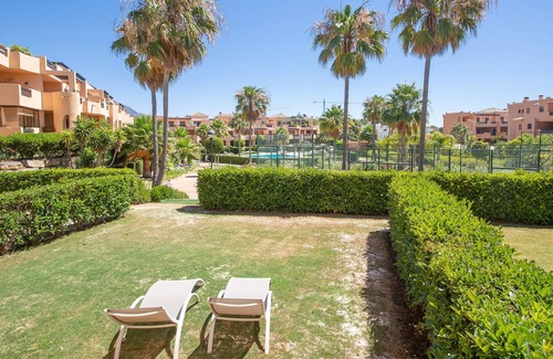 A very well presented spacious two bedroom, two bathroom apartment located on the ground floor with a covered terrace that has glass curtains and a private garden. The apartment is furnished in a modern style and comes with wifi, air conditioning, large fully fitted kitchen with dishwasher and washing machine, two bathrooms one has a walk in shower and the other has a bath. From the lounge there are patio doors leading on to the terrace and out to the private garden. Please note this apartment does not have underground parking available however there is plenty of free parking around the complex.Located in a small low rise complex, all built around a communal pool, free padel tennis court and gardens. Dona Julia golf course is just 50mtrs from the complex and the beach is a 10 minute walk away or just a couple of mintues by car.Communal facilities are subject to availability.