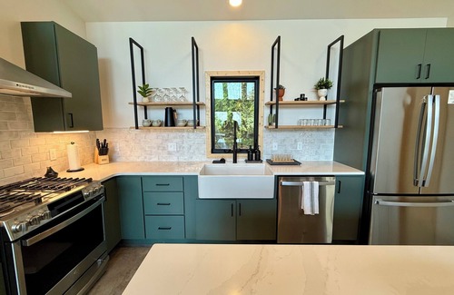 Our large kitchen island serves as the natural gathering spot, equipped with a fully-stocked kitchen that makes meal preparation easy. Whether you're brewing morning coffee while taking in those stunning lake views or preparing hearty après-ski dinners after a day on the mountain, this space brings people together in the most natural way.