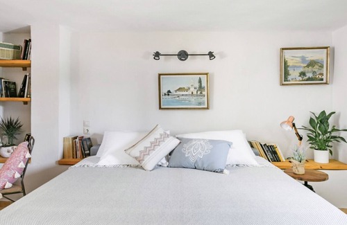 Cook breakfast in a radiant kitchen with wood surfaces and dine outdoors at a glass table in the tree-shaded yard. This home glows with idyllic charm by way of its terra cotta tile floors, traditional decor, and mix of modern and classic furnishings. Surrounded by gardens and lemon trees, the guesthouse is part of a historic manor home dating from the 17th century. It’s set in the countryside town of Skripero on the island of Corfu. In town, there’s a grocery store, as well as cafes and shops.
