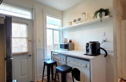 The bathroom has a full sized tub with massage shower and large mirror vanity.The kitchen is fully equipped, with a fridge, stove, washer, dryer and many small appliances including a Saeco bean-to-cup espresso machine, toaster oven, microwave, kettle, popcorn maker, air fryer, coffee grinder, etc. A window AC, portable oscillating fan, dishes, cups, cutlery, utensils, pots & pans, baking trays, extra linens, vacuum cleaner, etc. are all provided to make you feel even more at home during your extended stay.