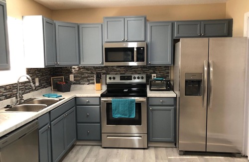 The property is a spacious and fully furnished two bedroom apartment that sleeps four people. The upper level has two comfortable bedrooms with a bathroom that caters to both rooms. The bedrooms each have a queen size bed and a Smart TV with Spectrum cable and high-speed Wi-Fi. The lower floor features a large living room with a Smart TV, a kitchen dining area, a large fully functional and furnished kitchen including all kitchen appliances large and small such as utensils, pots and pans, silverware, a Keurig coffee maker, a blender and more. The property has a dishwasher and a laundry room with a washer and dryer. There is a half bathroom downstairs. The property has a beautiful fenced-in backyard with a patio and sitting area. The home is fully updated and renovated.