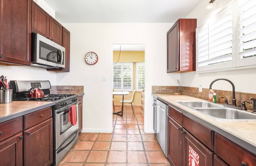 Comfortable and clean with an east-facing pool, this Palm Springs vacation rental offers tremendous views and lots of space to relax and unwind. Maintaining its original character while having been fully restored with modern amenities, gas fireplace newly installed, custom lighting, updated kitchen and baths, large windows, and french glass doors that let in year-round sunshine, this home is a great choice for your next Palm Springs getaway. Outside you'll find a family-friendly backyard, fully enclosed with lush green landscaping, palm trees, hedges, citrus, blackberries, a beautiful pool & spa, and breathtaking views of the gorgeous Palm Springs mountains to the west. The living room features vaulted ceilings, comfortable seating, a 55' HDTV, and a cozy fireplace in an open concept great room. The dining room is casual and comfortable, with seating for six and the adjacent living room offers additional seating and a desk area. The chef-inspired kitchen features tile counters with a modern artistic backsplash, so you'll be sure to find everything you need to prepare wonderful meals for friends and family.