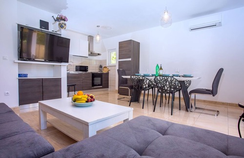 Beautiful, newly renovated house for 8 persons is situated in the center of Sestanovac, which makes it ideally strategically positioned. Just 1 km from the highway entrance will ensure your fast approach to all that Dalmatia can offer for your perfect holidays. All rooms are situated on the ground floor which is covered with three AC unit for your comfort. Beautiful 500 sqm outside area is builded around the big pool and nice jacuzzi will provide you with enough sun, shade and refreshment during your stay.