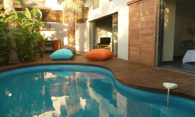 Located 50 meters from the beach, Lagoon Trou d'Eau, villa completely renovated, very quiet, 4 air-conditioned rooms, 2 bathrooms, 2 toilets, kitchen, swimming pool, deck, Balinese kiosk. Towels and linens are provided. Provision of baby equipment: cot, high chair ..