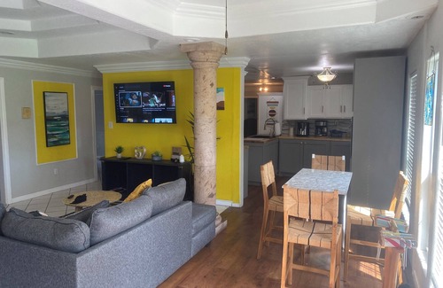 Discover the beauty of Brownsville from this 4-bedroom house. With 1 king bed and 3 queen beds, this awesome property offers 2 spacious living rooms with an additional full bed. Enjoy the convenience of a washing machine, Wi-Fi, and AC during your stay. The 3 bathrooms are equipped with showers for your comfort one with bathtub shower combination. Newly updated 4 Bedroom Sleeps 14, fenced in backyard with BBQ pit Gazebo area for bird watching. Large comfortable living area open to kitchen with large dining table and extra seating areas . TV trays. High chair, playpen, outdoor games. Washer dryer and all the extras needed to enjoy it like your own. 5 minutes from best restaurants in Brownsville and family fun places like bowling and theatres. Space-X and South Padre Island, 30 mins away. Big Shower in main bedroom ADA compliant, ADA shower chair. Secure fenced in backyard. View of Lake and Duck pond walking distance to Lots of places to eat and or exercise.