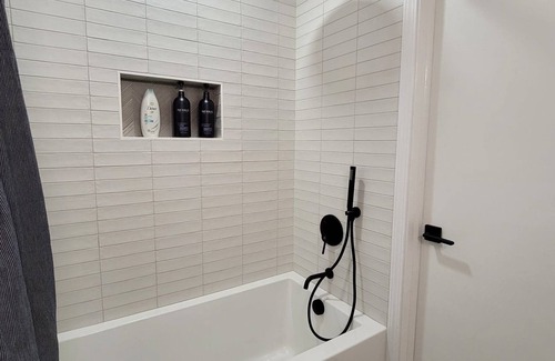 The bathroom is a tranquil oasis with a deep soaking tub and a shower combo, offering the perfect space to unwind and relax after a long day of exploring the city. The two bedrooms are furnished with comfortable queen-size beds, each featuring a memory foam mattress for a restful night's sleep.