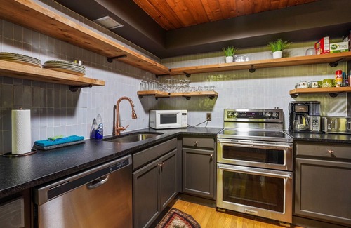 -Fully equipped kitchen including refrigerator, stove, microwave, coffee station, waffle iron, and countertop -ice machine