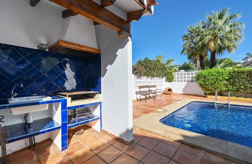 Classic and comfortable villa with private pool in Javea, Costa Blanca, Spain for 8 persons. The house is situated in a coastal, hilly and residential area, close to restaurants and bars and at 4 km from El Arenal, Javea beach. The house has 4 bedrooms and 2 bathrooms. The accommodation offers privacy, a beautiful lawned garden with trees and a beautiful pool. Its comfort and the vicinity of the beach, places to shop, sports activities, places to go out, sights and culture make this a fine villa to spend your holidays in Spain with family or friends and even your pets.