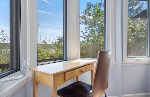 This is fun kitchen to cook in since you are lakeside. Kitchen has sliding glass doors to large lakeside deck. Cherry floors, granite countertops, pendant lights, dishwasher, garbage disposal, oversized fridge, eat-in table with seating for seven. Gorgeous views from almost every room, including 8 windows in the living room, 3 in the master bedroom, 3 windows and a three paneled sliding glass door in the kitchen and a 6 bay window and large picture windows in the downstairs bedroom. The house is renovated and modern. Hardwood floors and beautiful finishing touches everywhere. All kitchen items (pots, pans, plates), sheets, blankets and towels are provided.