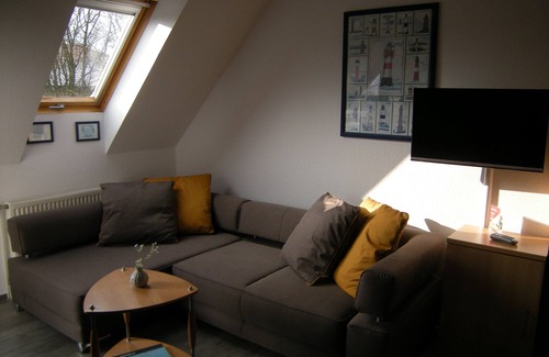 cozy attic apartment with two separate bedrooms for 4 people. Both bedrooms with double bed, living room with fitted kitchen, ceramic hob, fridge with 3 *** freezer, dishwasher, granite sink, balcony, shower room, apartment over 2 floors, completely covered with laminate, the apartment is on the second floor in the immediate vicinity of the Horumersieler Bathing beach, the spa facilities and the sea water swimming pool.