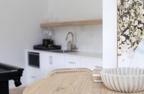The elegant main indoor living domain where you can gather around the gas log fire for drinks or with a book and a fully appointed home cinema for movie nights or watching the footy. There are 5 spacious and glamorous bedrooms, the master has a king sized bed, WIR, ensuite with shower, bath tub and a double vanity. The second bedroom also has a king bed and bedrooms 3 & 4 have queen beds. Bedroom 5 has 2 king singles or a king sized zip bed and a cot is available if you have an infant. The family bathroom features a bath and shower.