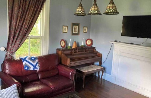 Originally built over 110 years ago for a local doctor, this home later belonged to acclaimed Southern author Guy Owen, best known for The Flim-Flam Man. Today, it’s been lovingly preserved to maintain its rich character, with original wood floors, antique doors and knobs, and thoughtful architectural details throughout. The upstairs bedroom offers stunning views of the Blue Ridge Mountains, while the master bedroom features its own cozy fireplace. Enjoy meals in the formal dining room, unwind in the sitting room with a second fireplace, and prepare celebrations in the fully equipped kitchen. There’s also a washer and dryer for your convenience, plus a guest room with TV. Parking is easy, with room for three cars on the property and additional parking available on the street. Come stay where history, beauty, and comfort meet.