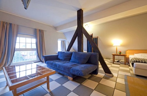 in a 200 year old listed building right next to the town hall. The apartment has internet, TV, full kitchen, box spring beds in hotel quality and much more. A bakery, pharmacy, 2 banks, discount stores and supermarket are nearby.