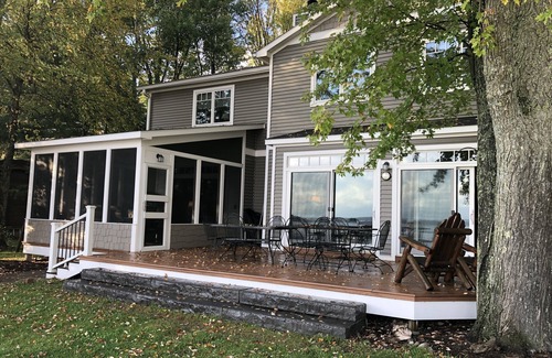This spacious and immaculate lakefront home is a four season nature lover's delight as it provides a truly spectacular, peaceful, wide-angle view of Green Lake as the home sits 25 feet from the water’s edge! Completely updated, this spacious home is perfect for a family holiday vacation or work from home flex-cation as it features high speed internet, a fully equipped kitchen, premium beds and linens, multiple large flat screened smart TVs, a fireplace, and room to work and play. The media room just updated with huge leather sectional seating for 10! The lakeside three season porch is perfect for a peaceful dinner or brunch, games or simply enjoying the this beautiful and magical lake. We invite you and your family or friends to come and enjoy the spectacular natural paradise. This special lake is large (two-thousand-acre) yet peaceful and not crowded. It is perfect for summer boating, fishing, swimming, and paddle boards and winter ice fishing and skating. Our particular site has a beautiful sandy beach and gradual sandy bottom. We rent year -round because all four seasons have their own unique beauty. This home has premium beds, and is air-conditioned with large windows to connect you to the breath-taking beauty surrounding you. It has a gas fireplace, family room with flat screen TV, Living Room. First Floor has its own Master Suite with private bath. Second Floor has 6 bedrooms and four full baths including 1 large Bunk Room