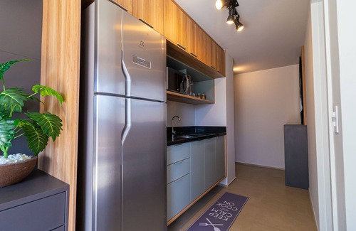 Complete and comfortable studio, it has a clean decoration that combines design and modernity with an urban touch of the city of São Paulo, in beige and gray colors, it has wooden shelves, gray cabinets, warm lamp chandeliers with regulated lighting and studio spots. The apartment has a dining table, induction cooktop, refrigerator, microwave, kitchenware, bowls, 42" television, queen-size bed and white bathroom with window. In addition to air conditioning, we offer comfortable bedding. and new, iron, hangers, shampoo, soap and hair dryer.