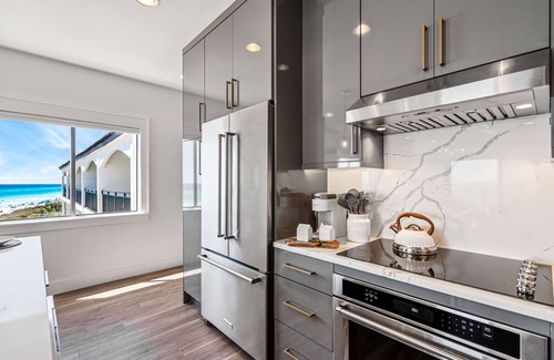Just ONE MILE and walkable to the community of SEASIDE, Unit C15 is a completely remodeled 1 bedroom, 2 bathroom BEACHFRONT oasis featuring ALL LUXURY Finishes throughout, all light and bright, with high end pro appliances, a peaceful master bedroom, 2 bunks for the kids in the hallway, a new WASHER/DRYER in unit, and a gorgeous new kitchen with island seating for 6! Everything in this unit is new, including all appliances, flooring, cabinetry, tile, bathrooms, TVs, and on and on. Even the balcony railing and sliding glass doors are new! 2 full-sized bathrooms. 2 cozy hallway bunks with reading lights for the kids (bunks are 5" inches shorter than standard length).