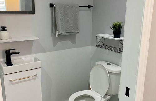 The Guest Suite is located in the basement of a townhouse in a quiet residential neighborhood with a private entrance and smart lock.