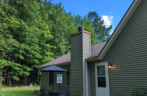 Enjoy the peace and quiet of 25 wooded acres with all amenities including a wood burning fireplace, jetted tub, laundry and full kitchen. Two bedrooms, each with a queen bed. Additional queen pull out sofa. Close to Spire , wineries and Geneva on the lake. Easy access from 90. Owners on site .