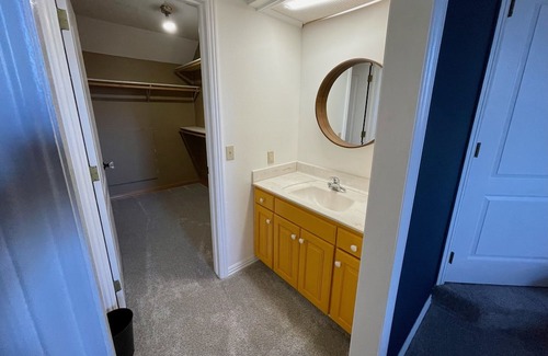 - 2 bedrooms with queen beds, walk-in closets, and private sinks