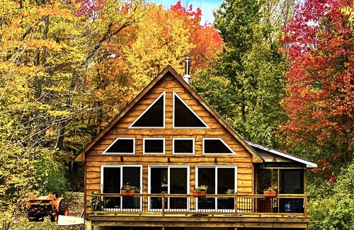 Peaceful, serene chalet off the grid cabin, powered by generator, nestled in the woods with beautiful views of Lake Pennock. There are 3 floors of living space.