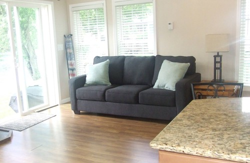 Cottage has an open floor plan. Kitchen is updated with all stainless steel appliances and granite countertop. Island has seating for three. Small kitchen table seats two. Living room offers a pullout couch and a flat screen tv with Youtube TV. The two slider doors give you a gorgeous view of the river.