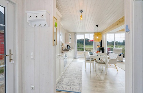 This light-flooded vacation home is located only a few minutes walk from the harbor. The house is located at the far edge of the complex (therefore only one direct neighbor), with a beautiful view of meadows and fields. The sun terrace in front of the house invites you to linger, eat together and relax. The outdoor area to the side of the house is filled with gravel and equipped with pallet furniture, so that the sunset over the field can be enjoyed with a glass of wine. Whether on the terrace for pleasant summer evenings, inside the house in front of the fireplace by the crackling fire or on the open gallery with fully equipped play corner - relaxation is guaranteed. Fast internet is provided with fiber optic connection.