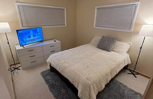 3 bedrooms with 2 having queen size beds and 1 with a queen sized Japanese floor mattress for ultimate comfort and relaxation. Plus 2 sleeping futons located In the basement recreation Area to accommodate 6 guests. Also located in the basement includes A corner Bar & recreation area with a movie theater projector setup for streaming off your own devices. A separate workout room and separate laundry room. Also included are a 75inch screen TV in the common living area and two smaller flat screen tv's in bedrooms. Outside during spring & summer months will be a patio table and chairs a fire pit and charcoal grill.