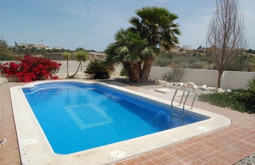A shaded net fly enclosure overlooks the pool complete with table and chairs for alfresco dining. The pool also has a paved patio area adjacent to it with sun loungers and table and chairs, shaded by palm trees. The villa has a fully equipped kitchen with a full size fridge freezer, washing machine, gas hob, electric oven and microwave, and all the necessary kitchen utensils. Digital TV channels, DVD player and WIFI are included. The gardens, which include orange,lemon and palm trees are completely enclosed with a gated driveway.