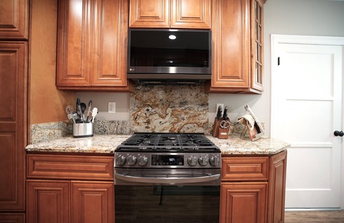 On the first floor, you will find a beautiful kitchen with new cabinets, all-new black stainless steel appliances ( stove/oven, refrigerator w/3 choices of ice, microwave, and dishwasher) granite countertops, and a laundry room in the pantry. Adjacent to the kitchen is a large dining room table for 10 and sit-up counter for 2 and a large screen smart TV. The home features 1 King Master Bedroom with an en-suite bathroom, 1 Cal King Bedroom with a Jack 'n Jill bathroom (shared w/kitchen area), 1 Cal-King Bedrooms, 1 queen bedroom, and 1 additional bathroom in the hall, and a supersized family room. Rental features bonus private detached Casita with Cal-King bed and w/own full-size bathroom adjacent to pool. Most of the first floor is LVP flooring and the bedrooms all have carpet. The second floor enters into a loft game room (with a sectional sofa that has a queen sleeper sofa) and leads to a children's bedroom with full over full bunk beds and twin trundle underneath. All bedrooms have 55''+ LCD Smart TVs. The bathrooms are beautifully upgraded with granite/travertine/porcelain counters and tiled showers.