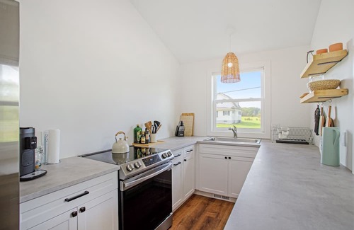 When all you want to do is relax, nestle down under the living room's high ceilings amidst soft seating and a large Smart TV. When you aren't hanging out here, the sunroom offers a pleasant spot to dine, visit, or simply flip through your vacation read. The home's well-equipped kitchen hosts a full suite of stainless steel appliances and ample meal prep space.